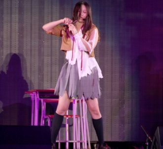 この日は、16位から順にソロ曲が披露された。総選挙15位の古畑奈和は「誰かの耳」を歌った。学校のチャイムが鳴り、喧騒の音が流れるなか、学生服に身を包んだ古畑のステージは、アリーナ横の通路にノートを拾い上げる。荒く息をはき、そこでEDMサウンドが響き楽曲が始まった。