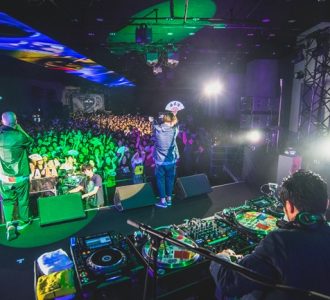 ここで、意表を突く出来事が。暗くなった会場の中、天井に設置されたプラズマビジョンにイベントスタートをイメージしたデザイン映像が流れ、待ちわびた観衆の気持ちをさらに煽っていく。そして程なくステージの一つに、MCを担当するラッパーのあっこゴリラが登場し、この日のスタートを華々しく告げた。