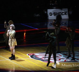 ほぼ同時に「キズナミ」が場内に流れ出ると、きゃりーがサプライズ登場。観客で埋め尽くされた場内は一気にヒートアップ。大歓声に包まれた。きゃりーは、ダンサーを連れてそのままコートの中央へ。
