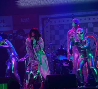 トップバッターは“世界、ドン引き”がコンセプトの愉快犯バンド・ドアノブロック。平均年齢20.2歳でドラム、ベース、ツインギターにボーカルという5人編。予想がつかない楽曲構成とセックスフラペチーノ(Vo)の破天荒なキャラと歌の表現力が魅力的なバンドだ。1曲目に披露したのは「バスタブとミラーボール」。グルーヴィなドラムとベースに、ディレイを効かせたスペーシーなフレーズにソリッドなリズムギターが絡むナンバーでスタート。一気にドアノブロックの世界観に引きずり込んだ。続いてはクリエイター集団れもんらいふ、振り付けにラッキィ池田を起用したオーディション中にMVが制作されたナンバー「プラスチック隕石」。中盤で見せたラウドなセクションではセックスフラペチーノのデスボイスが響き渡り、そこに宇宙人に扮したエキストラが多数登場。ステージを埋め尽くす迫力のある演出で、トップバッターという緊張感のあるステージを、堂々としたパフォーマンスで魅了した。