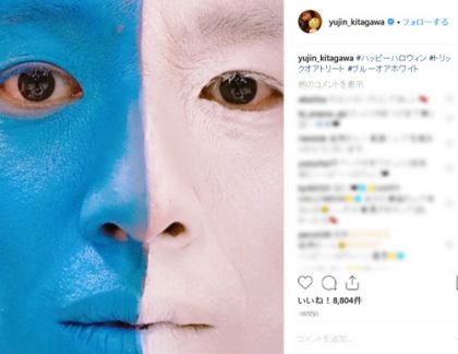 10月31日、インスタグラムを更新した北川。ハッシュタグのみの「#ハッピーハロウィン #トリックオアトリート #ブルーオアホワイト」という短い文章に添えたのが、本人と思われるどアップ写真。しかも顔の半分は青、もう半分は白に塗ってある。