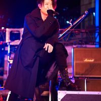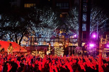 JIRO(Ba)は「寒い中ありがとうございます。ネオンも綺麗ですし、数年前この近所に住んでいて週何回もここに来ていたんですよ。やっとGLAYとしてもこのステージに立てて、夢が叶って嬉しいです」と語る。