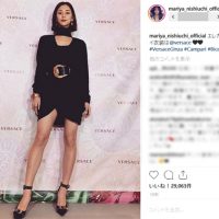 西内が着ているのはヴェルサーチェの服で、全体に黒で統一され、お腹部分には大きめのバックル。胸元は素肌がのぞけ、丈の長さは太ももあたりまでとなっており、西内の綺麗な脚が一目でわかる一枚になっている。