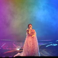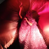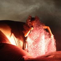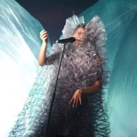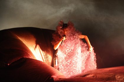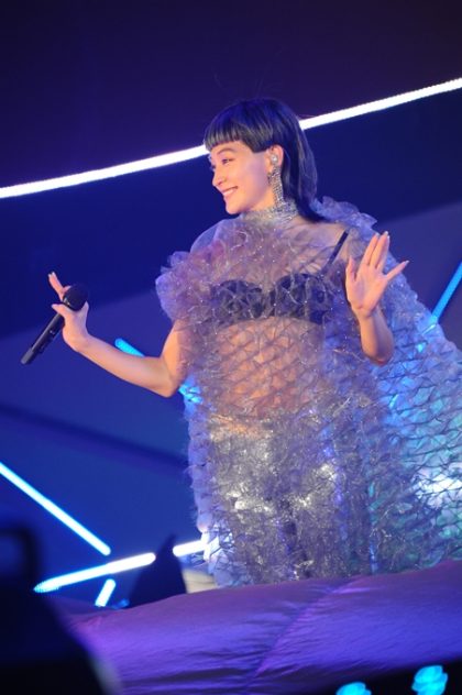 次に登場したのは、2012年からYouTubeにMVなどを上げて来た、水曜日のカンパネラ。スモークがステージを覆い、大きな風船状の巨大な布製のモニュメントが、顔まで覆うレースのような素材の衣装を着たコムアイの後方で徐々に膨らんでいくという演出で幻想的な雰囲気を醸し出していた。「一休さん」では、コムアイ自身が風船のようなモニュメントの中に入り、その布がめくれる様にして衣装チェンジしたコムアイが再び登場。凝った演出で観客を楽しませた。