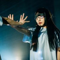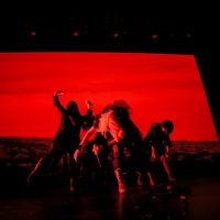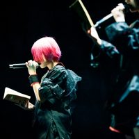 黒い衣装姿に着替えた4人は、蒼い色が支配した世界へ足を踏み入れた。弦楽の響きに合わせ流れだしたのが、「レインコートと首の無い鳥」。4人は演奏に合わせ、舞台の上をゆったりと舞う。その背景には、蒼く染まった雨が透明な水を浸食してゆく様が映し出されていた。その色は、いくつもの色を重ねながら、どんどん黒く濁していく。それは、人の心も黒く浸食し、聡明さを濁していくというメッセージ。
