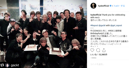 フォトニュース HYDE&綾野剛の誕生会の写真が話題(写真) HYDEがリツイートしたHYDE&綾野剛の誕生会の写真(Instagramより@hydeofficial) みんなの意見は?コメントを見る 関連写真・動画 View this post on Instagram Thank you for celebrating with me☆ 皆さんに祝ってもらいました☆ #Repost @gackt with @get_repost ・・・ 昨日DAIGOと共に、HYDE&綾野剛BirthdayPartyを主催した。 仲間たちも大勢集まってくれて二人の喜ぶ姿に感無量。 二人とも、これからも日本を代表する最高のオトコでいてくれぇ!ハッピーバースデー!! 協力してくれた仲間、スタッフ、関係者のみんな本当にありがとう。心から感謝してます。 それにしても酔った…。 っていうか、YOSHIKI!!! 来るの遅いよ‼︎‼︎ Yesterday me and Daigo celebrated HYDE’s and Ayano Go’s Birthday. So many friends gathered, yeah, I have no words to express how I felt seeing their happy faces. The two of them should absolutely represent Japan in the future! Happy Birthday! Thank you to all the staff, friends and guests who made this happen. I’m grateful from the bottom of my heart. Even so, I got drunk... also, YOSHIKI!!! Why are you so late!!! @GACKT @daigo_breakerz_ @hydeofficial #綾野剛 @kazuaki_kiriya @inoran_official @shinya_official @shinpei_breakerz @sid.aki @tatsuro_twitter @pelekusada @kiryu_in @syuusuke.s @pinakano0718 @hagichan0524 @takumisamejima @roland_0fficial @_genking_ @myfirststoryofficial #本郷奏多 @yoshikiofficial #GACKT #GACKTstagram #happybirthday #vksinger #actor #creator #出会えた仲間に感謝 #ありがとう #happytoseemyfriends #thankyou Hydeさん(@hydeofficial)がシェアした投稿 - 2019年 1月月25日午後11時56分PST 写真一覧 みんなのコメント コメントを書く(ユーザー登録不要) この写真の記事を読むHYDE&綾野剛の誕生会の写真が話題、GACKT、DAIGOら集結「豪華すぎる」 前の写真を見る →