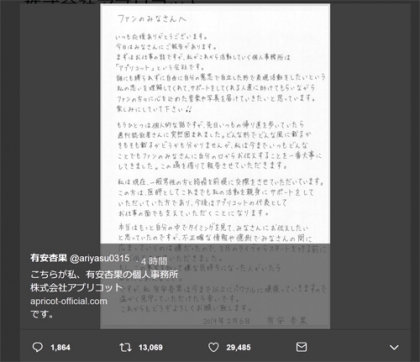そして、「もし、この事実を知って嫌な気持ちになった人がいたら本当にごめんなさい」と詫びた上で、「ですが、私 有安杏果は今まで以上にパワフルに頑張っていきますので温かく見守っていただけたら幸いです。これからもどうぞよろしくお願い致します」とファンに向けてメッセージを寄せている。