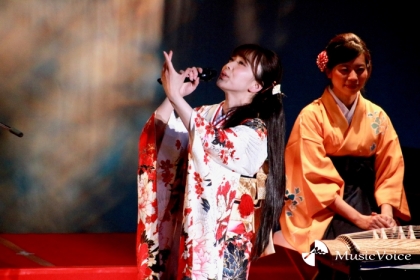 開演時刻になり、邦楽レディースによる太鼓の音色が響き渡り、杜このみが赤い着物でひな壇に見立てたステージに登場。福岡の民謡「黒田節」でコンサートの幕は開け、公開リハーサルでも歌唱した日本最古の民謡「こきりこ節」と杜のルーツである民謡を叙情的な歌声で歌い上げた。