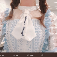 荻野がツイッターに公開した衣装は、白地に水色のラインが入ったもの。首元から下がったネクタイには「オキナワ パイナップル」とアルファベットで綴られている。