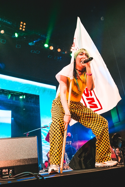 定刻になると、10カウントダウンからイベントがスタートした。最初のステージはあっこゴリラ。DJのPARKGOLFが「100%AKKOGORILLA」のビートを鳴らして、本人が登場。全身黄色の衣装で大きな旗を持って登場した彼女は「元気ですか? 準備いいですか?」と呼びかける。そしてSpotifyで162万回再生されているという「ゲリラ×向井太一」(向井は登場せず)でイベントが開幕。フロアにマイクを向け、参加を促しながら空気を作りあげていく。「グランマ」からサポートのBNNZが演奏し、メインステージとサブステージ前面を使ってパフォーマンスした。