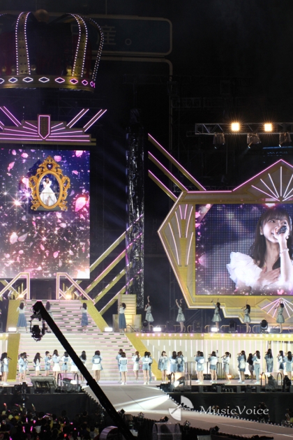 この日のコンサートで印象に残っているのは、最後の場面。指原はゴンドラに乗り込み、高さ数十メートルのところに設けられた巨大な王冠オブジェに収まるシーン。「王冠のところに行ってお礼を言ってから照明が落ちて全部が真っ暗になったときに、会場に光が残っていて凄く綺麗だった。本当はすぐにはける予定だったけど、しばらくいました」。