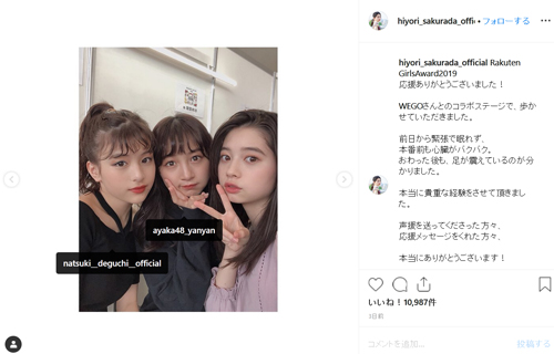 フォトニュース 桜田ひより&NMB48山本彩加&出口夏希3ショット(写真) 桜田ひよりが公開したNMB48山本彩加、出口夏希との3ショット(Instagramより@hiyori_sakurada_official) みんなの意見は?コメントを見る 関連写真・動画 この投稿をInstagramで見る Rakuten GirlsAward2019 応援ありがとうございました! WEGOさんとのコラボステージで、歩かせていただきました。 前日から緊張で眠れず、 本番前も心臓がバクバク。 おわった後も、足が震えているのが分かりました。 本当に貴重な経験をさせて頂きました。 声援を送ってくださった方々、 応援メッセージをくれた方々、 本当にありがとうございます! #ガールズアワード #ガルアワ 桜田ひよりさん(@hiyori_sakurada_official)がシェアした投稿 - 2019年 5月月18日午後11時12分PDT 写真一覧 みんなのコメント コメントを書く(ユーザー登録不要) この写真の記事を読む桜田ひより&NMB48山本彩加&出口夏希の「Seventeen」3ショット反響 前の写真を見る →