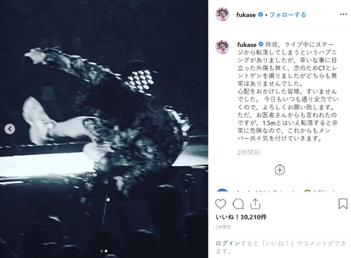 フォトニュース Fukase、ライブでステージから転落(写真2) Fukaseが掲載した転落の瞬間の写真(Instagramより@fukase) みんなの意見は?コメントを見る 関連写真・動画 この投稿をInstagramで見る 昨夜、ライブ中にステージから転落してしまうというハプニングがありましたが、幸いな事に目立った外傷も無く、念のためCTとレントゲンを撮りましたがどちらも異常はありませんでした。 心配をおかけした皆様、すいませんでした。 今日もいつも通り全力でいくので、よろしくお願い致します。 ただ、お医者さんからも言われたのですが、1.5mとはいえ転落すると非常に危険なので、これからもメンバー共々気を付けていきます。 Fukaseさん(@fukase)がシェアした投稿 - 2019年 6月月21日午後8時22分PDT 写真一覧 みんなのコメント コメントを書く(ユーザー登録不要) この写真の記事を読むセカオワ・Fukase、ライブでステージから転落 「異常なし」報告に安堵の声 ← 次の写真を見る