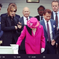 YOSHIKIは投稿に合わせて3枚の画像も掲載。直立して女王が移動する様子を見守るショットに続いて、黒いスカーフが女王にかかる画像では隣の女性が驚いた表情を見せている。そして、3枚目はあわてた様子のYOSHIKIの姿を確認できる。