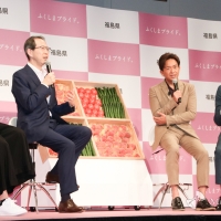 さらに、発表会では福島県産の桃ときゅうり、トマトを登壇者が試食。城島は桃を口に入れ「みずみずしくて甘くてとろけちゃいますね」と言い、松岡はきゅうりを食べ「美味しいですね。これでビール飲めます」と絶賛。