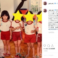 上野が公開したのは、体操服を着た自身の姿などをとらえた幼少期のもの。自身が記したように右手に短冊を持ち、“真顔”でじっとカメラのほうを見つめる姿が印象的だ。