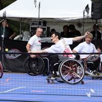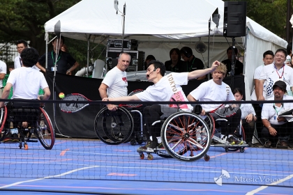体験を終え、草なぎは「良い運動になった。楽しかった。来年のパラリンピックに向けて楽しみになった。一生懸命に応援していきたい」と清々しい笑顔を見せた。稲垣も「車いすのコントロールは難しかった。すごく楽しいし、観ていても分かりやすい。基本的には普通のテニスと変わらない」と述べた。