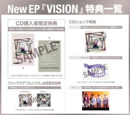 また、そのアートワークが生かされた購入者特典のデザインも一斉に公開。今回新たに発表された初回プレス封入特典の限定ラミネートパス、そしてCDショップ特典としてタワーレコード「VISION」ジャケットステッカー、9月11日までのタワーレコード早期予約特典となる「VISION」オリジナルツイストバンドも三原康司が全て監修したものになっている。