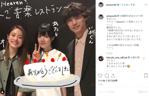 あいみょんが公開した石原さとみ&福士蒼汰との記念ショット(Instagramより@aimyon36)
