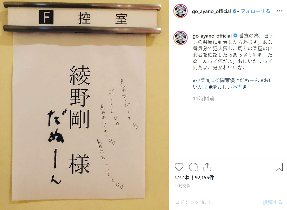 フォトニュース 綾野剛、小栗旬&松岡茉優の“落書き”(写真) 綾野剛が公開した小栗旬&松岡茉優の“落書き”(Instagramより@go_ayano_official) みんなの意見は?コメントを見る 関連写真・動画 この投稿をInstagramで見る 番宣の為、日テレの楽屋に到着したら落書き。あな番気分で犯人探し。周りの楽屋の出演者を確認したらあっさり判明。だぬーんって何だよ。おにいたまって何だよ。鬼かわいいな。 #小栗旬 #松岡茉優 #だぬーん #おにいたま #愛おしい落書き 綾野剛 Go Ayanoさん(@go_ayano_official)がシェアした投稿 - 2019年 9月月11日午前3時53分PDT 写真一覧 みんなのコメント コメントを書く(ユーザー登録不要) この写真の記事を読む綾野剛、小栗旬&松岡茉優の“落書き”に「鬼かわいいな」