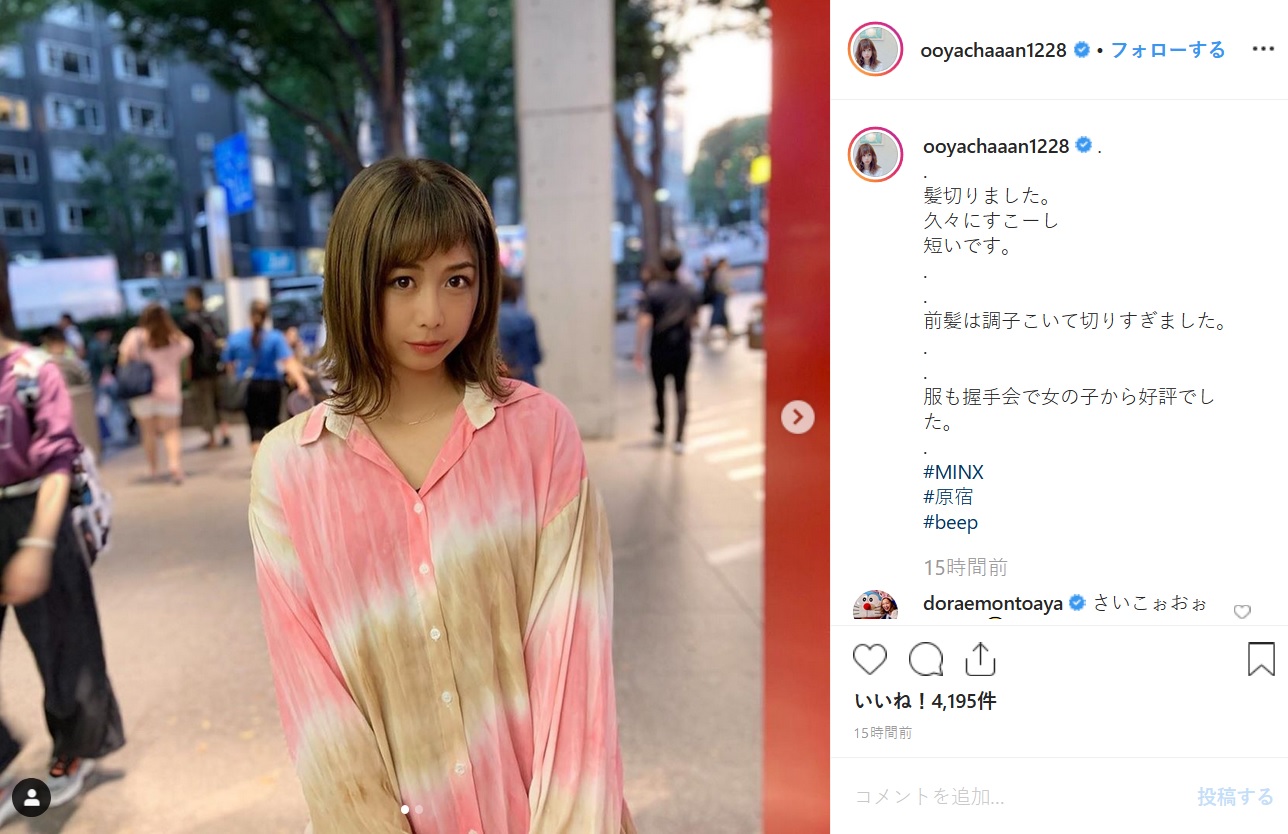 フォトニュース 大家志津香、ミディアムヘアに「ばっさり」イメチェン(写真) 髪をバッサリ切った大家志津香(Instagramより@ooyachaaan1228) みんなの意見は?コメントを見る 関連写真・動画 この投稿をInstagramで見る . . 髪切りました。 久々にすこーし 短いです。 . . 前髪は調子こいて切りすぎました。 . . 服も握手会で女の子から好評でした。 . #MINX #原宿 #beep 大家 志津香さん(@ooyachaaan1228)がシェアした投稿 - 2019年 9月月24日午前12時18分PDT 写真一覧 みんなのコメント コメントを書く(ユーザー登録不要) この写真の記事を読むAKB大家志津香「髪切りました」ミディアムヘアに「ばっさり」イメチェン