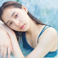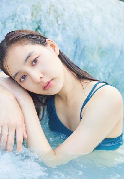朝に撮影された収録カット<2>のシーンでは、ナチュラルすっぴん風メイクとブルーのワンショルダービキニ姿を披露。水着姿で露わになった細い腕と、デコルテから胸元にかけてのライン、みずみずしく透明感のある肌が美しく、“誰もいない朝の温泉”というシチュエーション、気を許した恋人だけに見せるような、少し甘えてこちらに向ける表情が、二人っきりの甘い時間を彷彿とさせ、特に男性ファンの心をくすぐる一枚となっている。