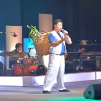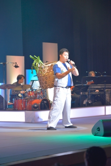 ステージは、トレードマークの作業着と畑で使用する背負籠姿で登場し、満席の客席から大きな掛け声がかかり、なんとも温かい雰囲気に包まれスタートした。