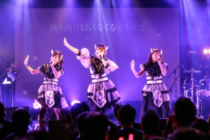バンドメンバーがスタンバイし、SEに乗って新衣装で登場した滝口きららがソロダンスパフォーマンス、そこに木乃伊みさとと滝口ひかりが加わり「アンバランス」でツアーファイナルの幕は開けた。メンバーも歌いながら「まだまだ行くよ!」など、合いの手を入れ、オーディエンスを煽り生バンドによる躍動感に観客も序盤から大きな盛り上がりを見せ、3人もツアーを回って、歌もパフォーマンスも仕上がって来ているのを感じさせる。みさとが「みんなで一緒に踊ってください」と投げかけ始まったのは、盛り上がり必至の「のっぺらぼう」では、オーディエンスも巻き込んで、一体感を作り上げた。