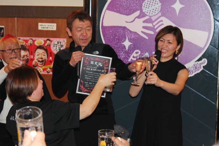 『今日に至るまでゆっくりゆっくり進んでまいりました。ようやく100店目のママに認定書を渡す日がやってまいりました!盛り上がっていきましょう!皆さん、お酒は足りていますか!!』の掛け声に会場は大盛り上がり。