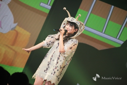 勢い良く飛び出した久保はわたあめを連想させるレインボーカラーの衣装。ステージバックのスクリーンには予報通り、わたあめ雲にキャンディの雨。そのなかで「最強ツインテール」を届けた。2曲目「初恋ダッシュ」ではトロッコに乗り手紙を渡す。間奏では「声出せますか!」と煽った。
