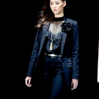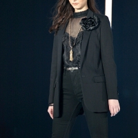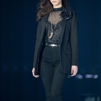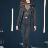 TGCの最初のステージは、スタイリスト・野口強氏プロデュースのステージ。70年代のヨーロッパのファッションをオマージュ。新木は黒のスーツに身を包み、レースのブラウスも印象的。イギー・ポップの「Lust For Life」に乗せて、クールな表情でランウェイを歩いた。