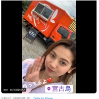 その動画でゆきぽよは「満月食堂」と書かれたお店をバックに、「はーい、宮古島に来ております」と報告。その表情は化粧を施していないようなナチュラルメイクが印象的だ。
