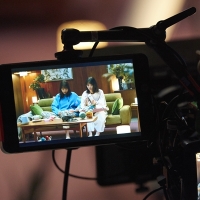 カットがかかったあとも、本当の姉妹のように仲睦まじい様子で話す有村と浜辺。撮影の合間に有村が撮影セットにあった健康器具を使ってストレッチをすると、浜辺から「(身体が)やわらかい!」と驚きの声が上がり、一緒にストレッチをする様子も。その後も、有村と浜辺の会話は途切れることなく、終始2人の笑い声が絶えない現場となった。