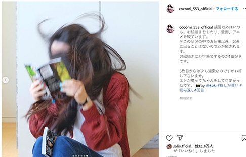 Cocomiが投稿したもう1枚の写真。荒れ狂いながら「鬼滅の刃」を読んでいるショットも反響を集めている(Instagramより@cocomi_553_official)