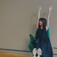 ヘアメイクは黒髪が印象的で、切りっぱなしロブでこなれ感。赤く塗られたリップがコーディネートを引き締め。足元はスニーカーで抜け感を演出し、華やかなワンピースをややカジュアルな印象にさせている。