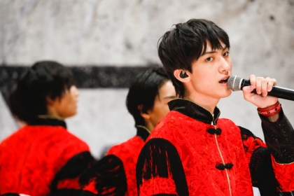 フラッグを背後に並べ終えたところで毅が「俺達がSUPER★DRAGON」と告げ、ライブを幕開けたのは、リモート期間を通じて居場所を再確認させてくれたファンへの感謝と未来への決意を込めた新曲「SUPER★DRAGON」。躍動する四つ打ちに乗り、全身赤と黒で統一した装いで“俺達が時代を変える”“Just SUPER★ DRAGON rises on”と、勇ましい想いを限界ギリギリのトーンで吐き出す彼らからは、昇り龍としての覚悟があふれんばかりに伝わってくる。