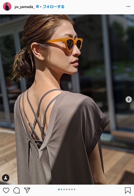 ワンマイルウエアの軽やかコーデを披露した山田優。大きく開いた背中が「オシャレ」とも(Instagramより@shioritamai_official)