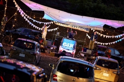 ヒントとなったのは、1990年代のバブル期にブームとなった車に乗ったまま映画を鑑賞する「ドライブインシアター」。これまで、ライブを活動の軸に様々なエンターテイメントをと展開してきた彼らは、生のライブを実現する方法として、ソーシャルディスタンスのルールにのっとり、野外に設置されたステージの前にクルマを止め、カーステレオのFMラジオを通じて車内に音声を届ける仕組みで行われた。