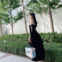 黒のベアドレスで色っぽい肌見せコーデで、上半身はタイト、裾部分はフレアになっている。腕部分のリボンが上品だ。