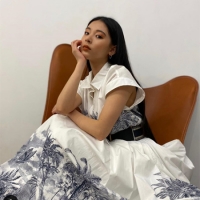 ヤシの木が描かれたフレアの白のドレスは、見ている側もリゾート気分を味わえそうな爽やかなデザインで、黒の太ベルトも特徴的。