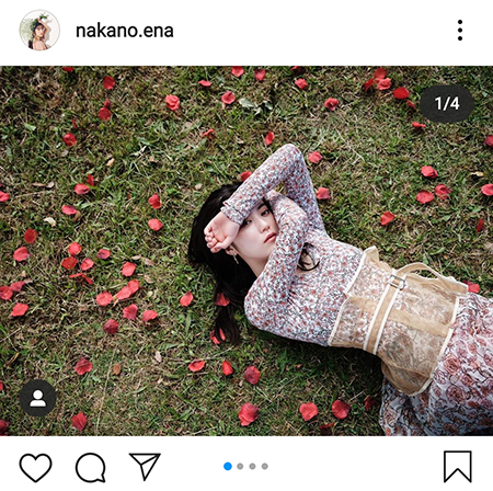 「作品撮り」と綴って4枚の写真を投稿した中野。うち2枚はバラの花を散りばめた野に仰向けになる姿で、アートの様な写真だ。