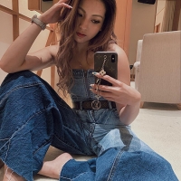 ゆったりとしたワイドデニムでこなれ感を演出。ベルトは『LOUIS VUITTON』のもので、スマートフォンケースも同ブランドを使用している。