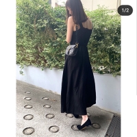 コーディネートの主役は、「Dior」のバッグ。ゴールドのメタルパーツが上品に輝き、暗めのカラーを基調としたデザインで全体との統一感も。