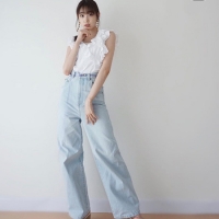 合わせるボトムは、デニムワイドパンツ。ライトブルーのカラーで夏らしさを感じさせ、白のトップスと合わせると爽やかな印象に。トップスをインしているため、より脚長効果も。