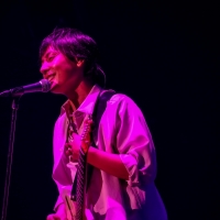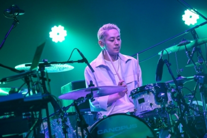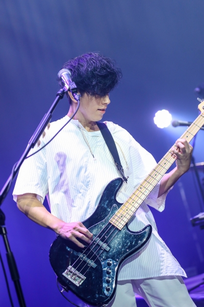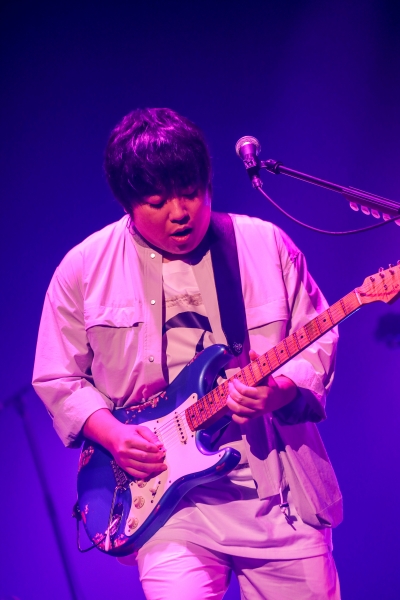 メインステージに戻った4人は、「ほうれん草のソテー」を披露。<いつものファミレスで>という歌詞では自然に、直前の映像が思い浮かんでくる。1つのテーブルで向き合って会話していた4人の楽し気な空気感そのままに、音と音もテンポ良くリズミカルに絡み合っていく。ピッタリと合った呼吸は次曲「アップデイト」の演奏にも引き継がれ、バンドサウンドならではのダイナミズムを発揮。ライヴは終盤に突入し、小倉のドラムに乗せて山村が「楽しんでくれてますか~? 皆、行けますか?」とオーディエンスに呼び掛けると、「PEPEパラダイス」へ。ゴージャスで艶やかなロックサウンドが響き渡り、阪井はギターを激しく掻き鳴らす。ピークを迎えた興奮は、「虹の傘」の静けさでそっと鎮められた。山村も阪井もアコースティック・ギターを爪弾き、コーラスワークは清らか。尼川は2段組のシンセサイザーでオルガンのような音色を奏でていく。雨粒を思わせる無数の光の粒が会場を照らし、そこには現実とも非現実ともつかない、幻想的な光景が広がっていた。