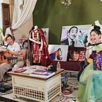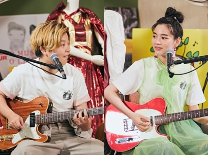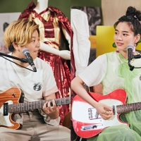 20時ちょうど、配信の画面には、これまでの衣装、グッズTシャツにポスターやフライヤーが所狭しと並べられたステージが映し出される。まるでのんの自宅から中継しているようなステージだ。のんは愛用の真っ赤なテレキャスターを抱えて右側に、サイドテーブルを挟んでディスタンスを取って、ひぐちけいは左サイドに座る。先ずはサディスティック・ミカ・バンドの「タイムマシンにおねがい」でライブはスタート。2017年8月のワールド・ハピネス出演時に披露した曲で、ファースト・カセット「KAIWA(RE)CORD オヒロメ・パック」に収められた、のんのデビュー曲だ。