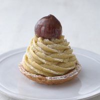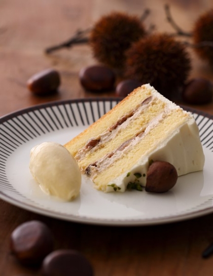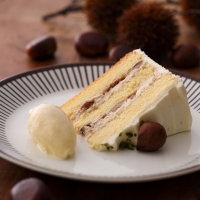 ■商品説明:しっとり焼き上げたスポンジに異なるマロンペーストをカスタードと生クリームそれぞれに合わせ、渋皮栗を