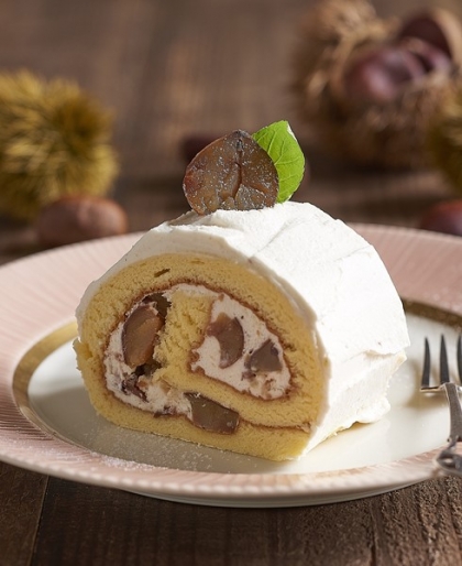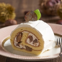 ■商品説明:栗ペーストと生クリームを合わせたマロンクリームと渋皮栗をしっとりふんわりとした生地でロールケーキに。
