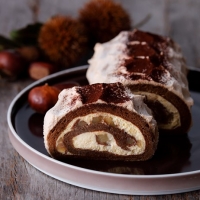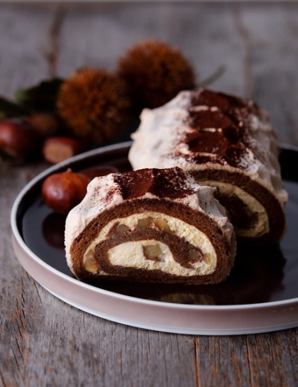 食感が楽しめる大きさに刻んだ渋皮栗とコクのあるマスカルポーネクリームを、コーヒーの香り豊かなしっとりとしたコーヒーシフォン生地で巻き上げました。栗を感じるマロンクリーム、ココアパウダーで仕上げています。