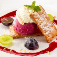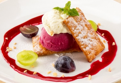 今年は新しく、サクサクのパイに甘さ控えめのマスカルポーネクリームとぶどうのソルベに2色のぶどうを添えたミルフィーユ風スイーツが登場。パイのサクサク食感と濃厚ぶどうソルベのひんやり感がマッチした、食後にもちょうどいいサイズのスイーツだ。
